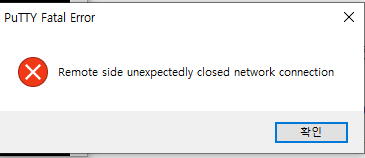 putty로 해당 서버의 접속하려고 시도했지만 다음과 같이 Remote side unexpetedly closed network connection이라는 문구가 나오면서 접속이 되지 않았다.